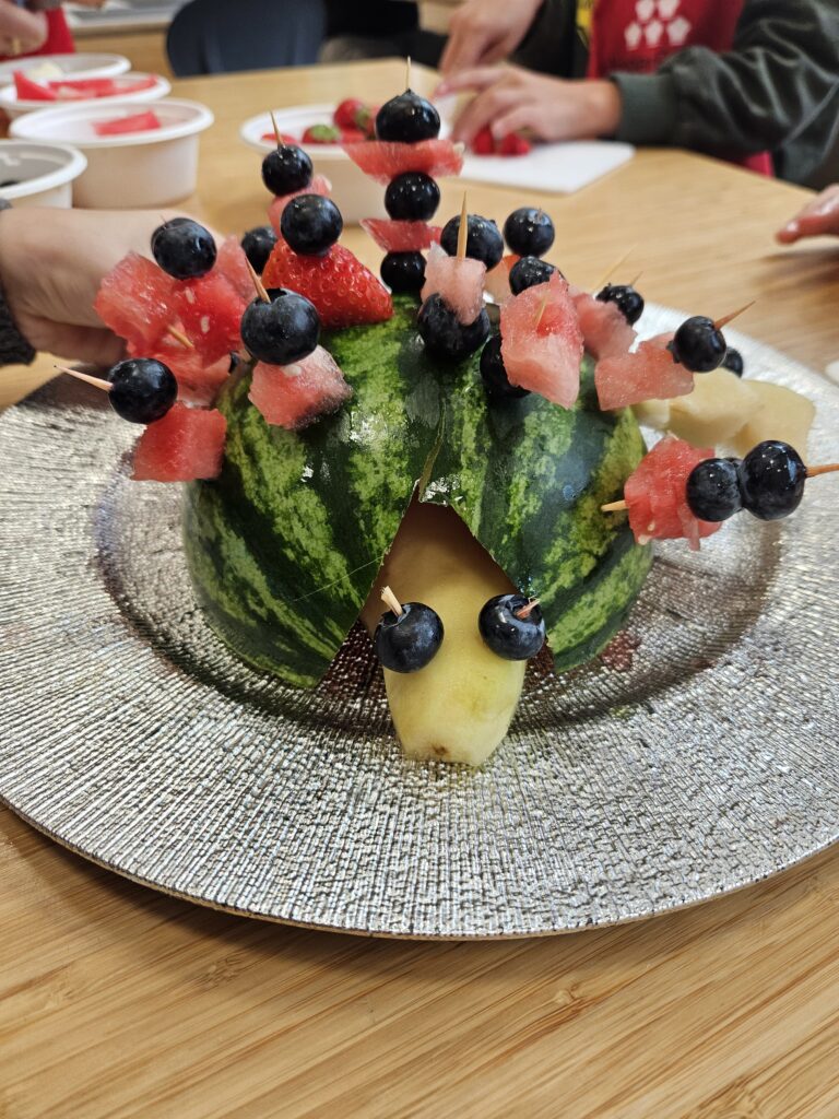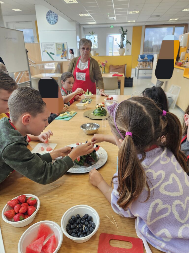 In de laatste les hebben zij egels gemaakt van fruit en groente. De kinderen werden verdeeld in twee groepen. Eén groep mocht spiesjes maken van komkommer, tomaat, blauwe bessen, kaas, meloen en banaan. Tijdens het maken mochten ze ook al lekker eten. De tweede groep ging aan de slag met ketchup, bladerdeeg en vega-knakworstjes en maakte heerlijke worstenbroodjes.