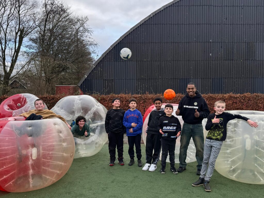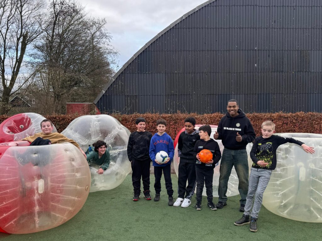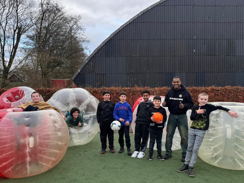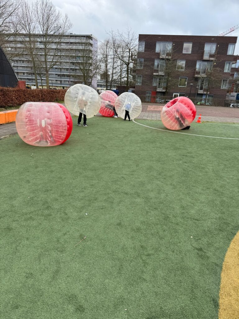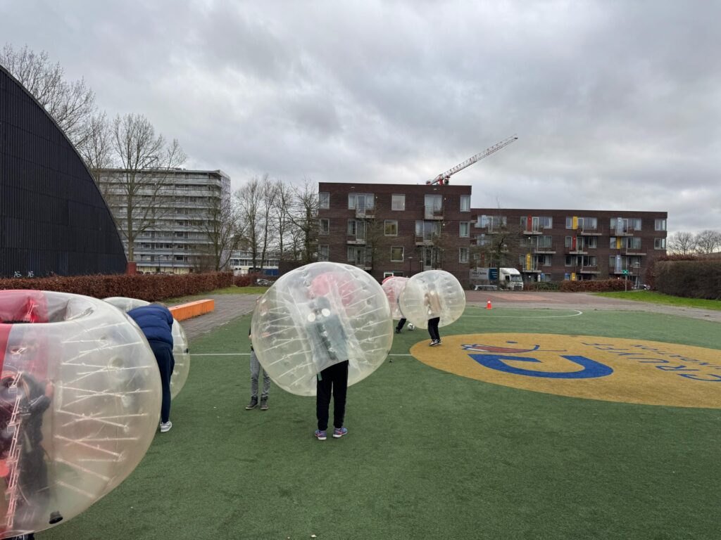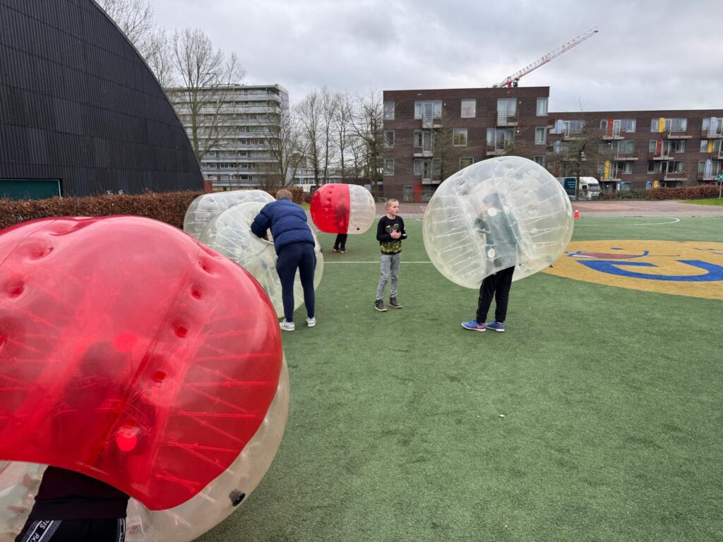 Bubbelvoetbal! Dit spel, waarbij de kinderen letterlijk in een grote opblaasbare bubbel zitten terwijl ze voetballen, zorgde niet alleen voor veel plezier, maar ook voor een unieke ervaring waarin ze écht uit hun bubbel stapten. Het was geweldig om te zien hoe ze enthousiast en vol energie de uitdaging aangingen.